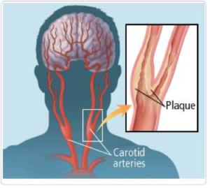 TIAs are warnings that have to be heeded to prevent a major stroke in the following few months. Like the first drops of rain before a thunderstorm. The risk factors for stroke are very very similar to those of a heart attack. A bad lipid profile, diabetes, hypertension and smoking. These 4 horsemen herald the development of atherosclerosis and narrowing of the arteries in the body. Most evaluations of patients following a TIA focus on identifying and correcting these abnormalities. In addition, an important test is to look at the carotid arteries – the two main vessels that carry blood into the brain and are in front of the neck. And what every movie star checks to see is someone is alive. The carotids may gradually get narrowed by fat deposition within the vessels, also called an atheromatous plaque.